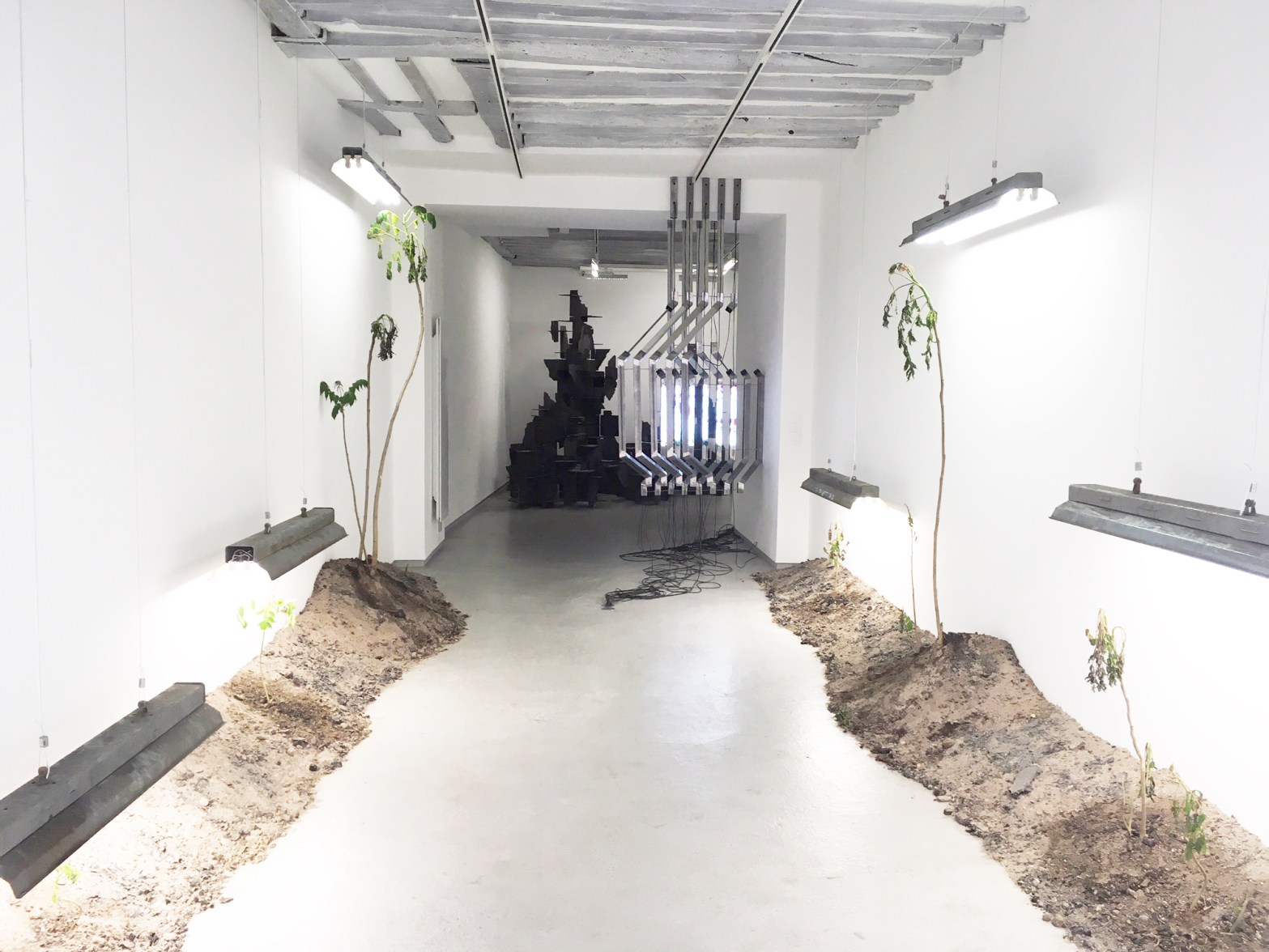 Nous entrons dans l’exposition à la Galerie Bertrand Grimont comme pour voir une étude scientifique sur le Blob. Dés le passage du seuil de la galerie nous sommes face à des plantes misent en terre à même le sol, au-dessus d’elles des projecteurs lumineux. Mais ils s’agit bien d’une exposition artistique ou la notion de Blob, si on peut appeler cela une notion, plutôt la chose que l’on appelle Blob, car on ne sait pas trop comment nommer cette masse colorée qui s’étale en forêt sur plusieurs mètres carrés, recouvrant des branches entières, est à l’honneur.