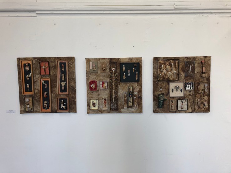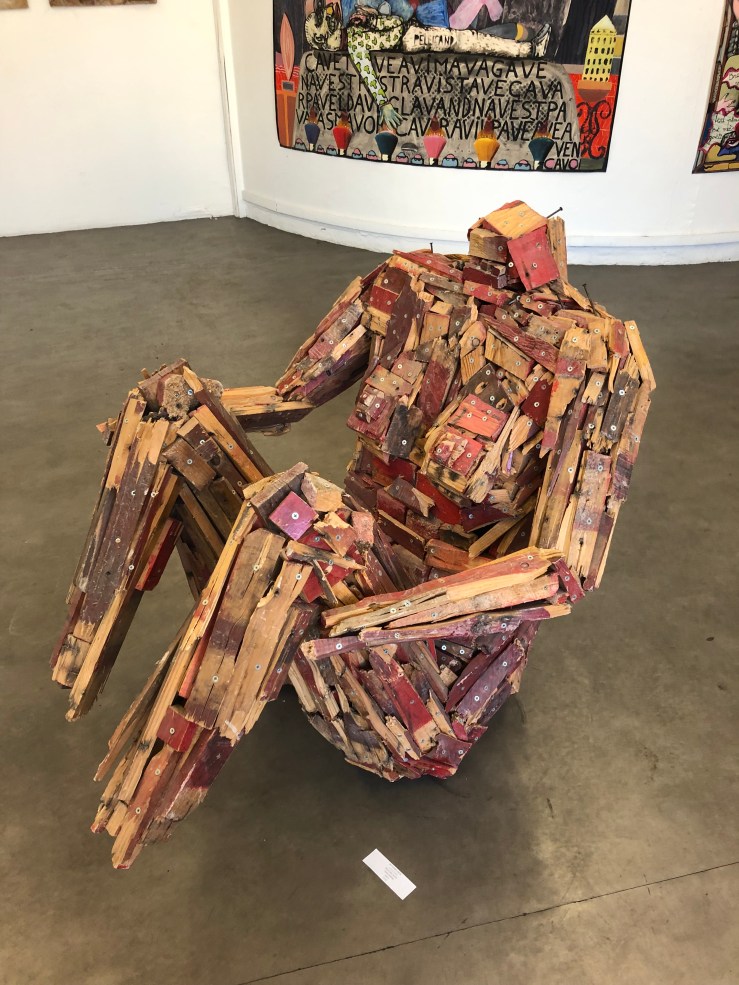Ce que j’étais en train d’arpenter c’était la ville de Lyon, revenant de la visite des Subsistances et de l’école des Beaux-Arts de Lyon, voilà que je tombe sur la place des Terreaux. J’aperçois une galerie, qui m’était encore inconnue. Une Biennale Hors Normes[2] s’y trouvait. En jetant un coup d’œil, je vois des peintures et des sculptures qui me font penser à George Baselitz ou encore à Jean Dubuffet. Cela ressemble à de l’art brut, et vous commencez à connaitre ma passion pour cet art particulier. Bien que certains artistes se revendiquent ici d’un art Naïf, ce n’est pas vraiment le cas non plus. Dans cette exposition les apparences sont trompeuses, mais on comprend leur amour de la matière. Malgré certaines sémantiques que les artistes essaient de faire émerger, c’est la texturalitée de leurs œuvres qui frappe.