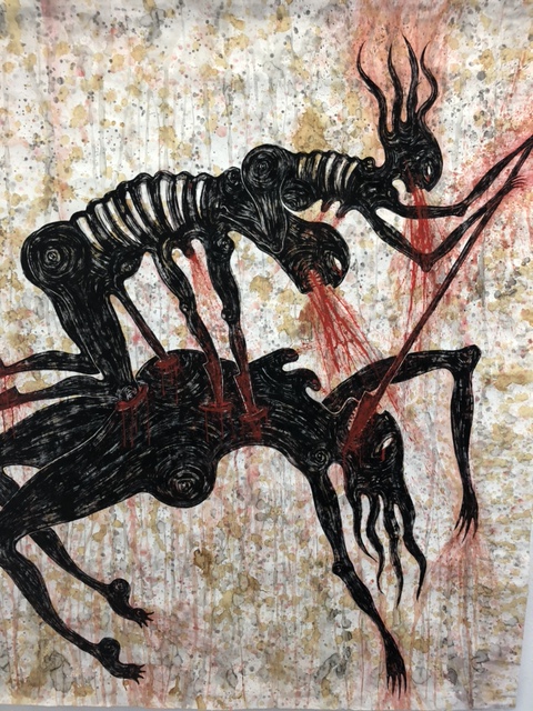 Le « corps » se situe au cœur de l’œuvre de Catherine Ursin. Corps dessiné, sculpté, photographié, violenté, torturé, toujours percutant et brutal, liaison entre passé et futur, instant suspendu entre rupestre et sidéral, en mouvement perpétuel. Son Œuvre picturale dans la galerie est ici transgressive, hétéroclite, inclassable. Le corps est représenté dans toute sa monstruosité et sa marginalité.